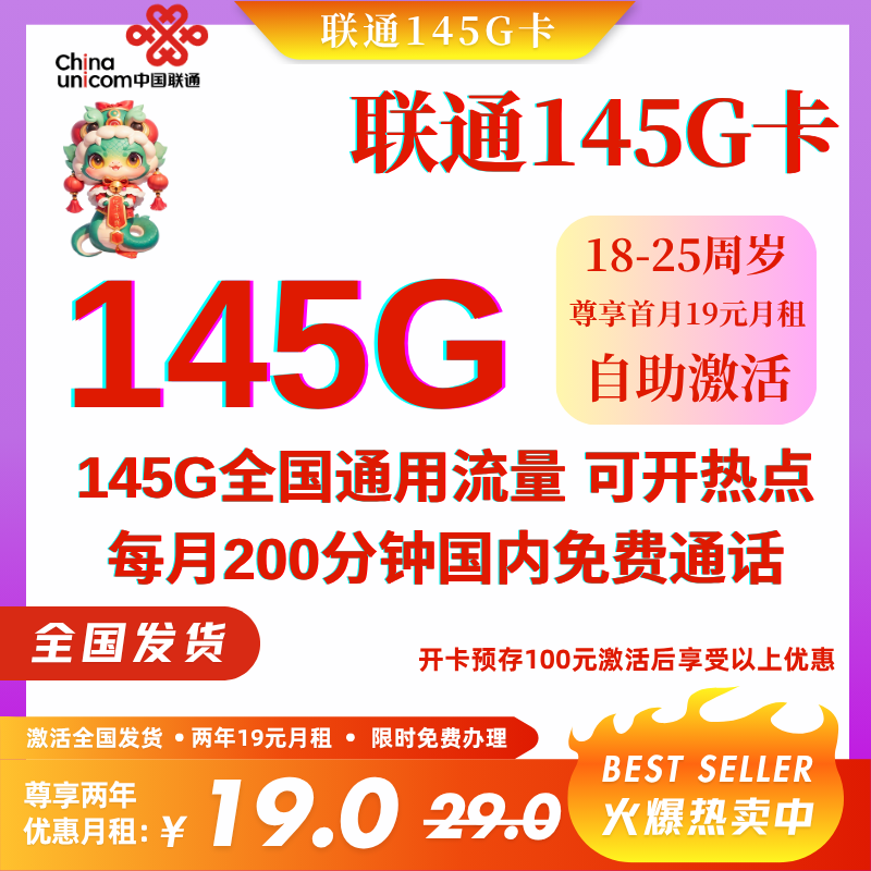 19元145G全国通用流量+200分钟国内通话(两年优惠)