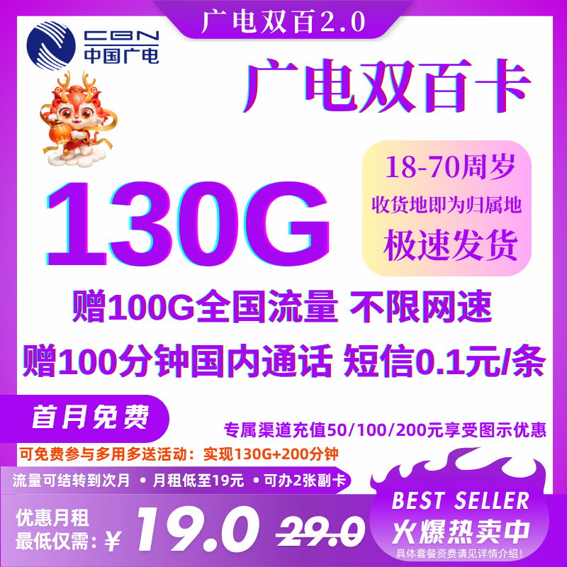19元130G通用流量+200分钟(流量、通话长期优惠)