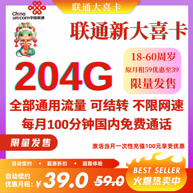 39元204G通用流量+100分钟通话(2025年底前限时限量发售)